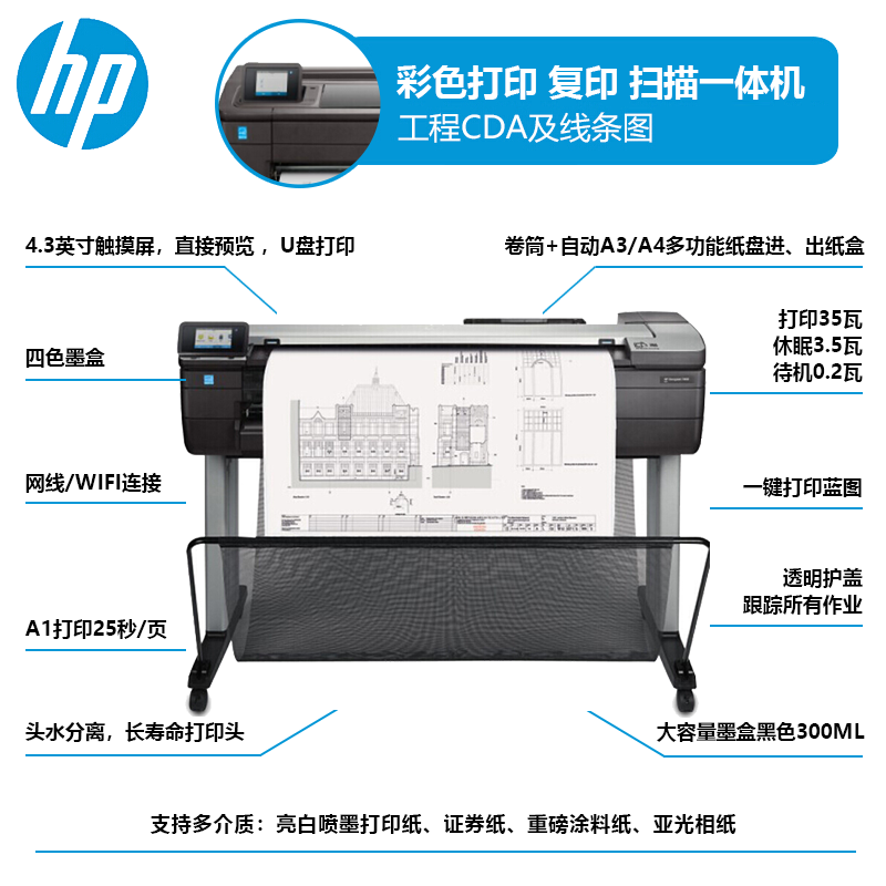 惠普(HP)绘图仪T1708dr+PS B0+44英寸6色双纸轴