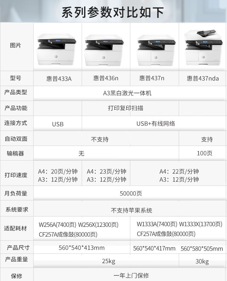 惠普(HP)M72625dn a3a4黑白激光数码复合机 打印复印扫描多功能一体机 大型办公企业级 72625dn(自动双面+有线网络+25页/分钟)