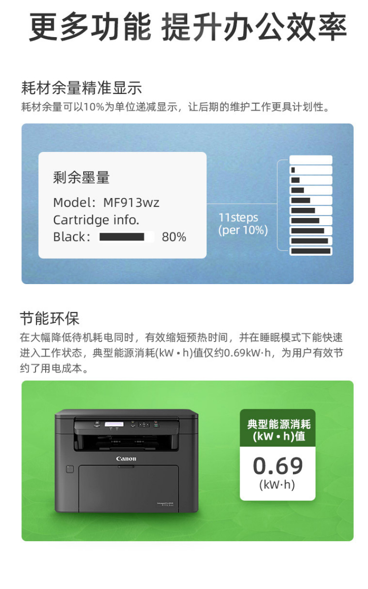 佳能(Canon)MF913wz A4幅面无线黑白激光多功能一体机(打印/复印/扫描/经济大粉仓/快速打印 办公/家用) 自营