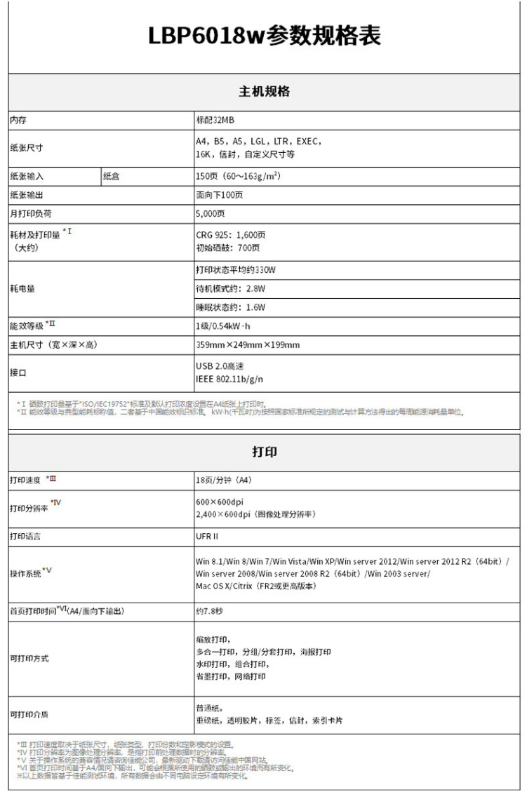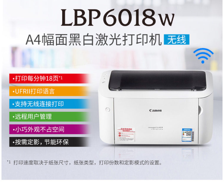 佳能(Canon)LBP6018w A4幅面无线黑白激光单功能打印机(快速打印/节能环保 家用/商用) 自营