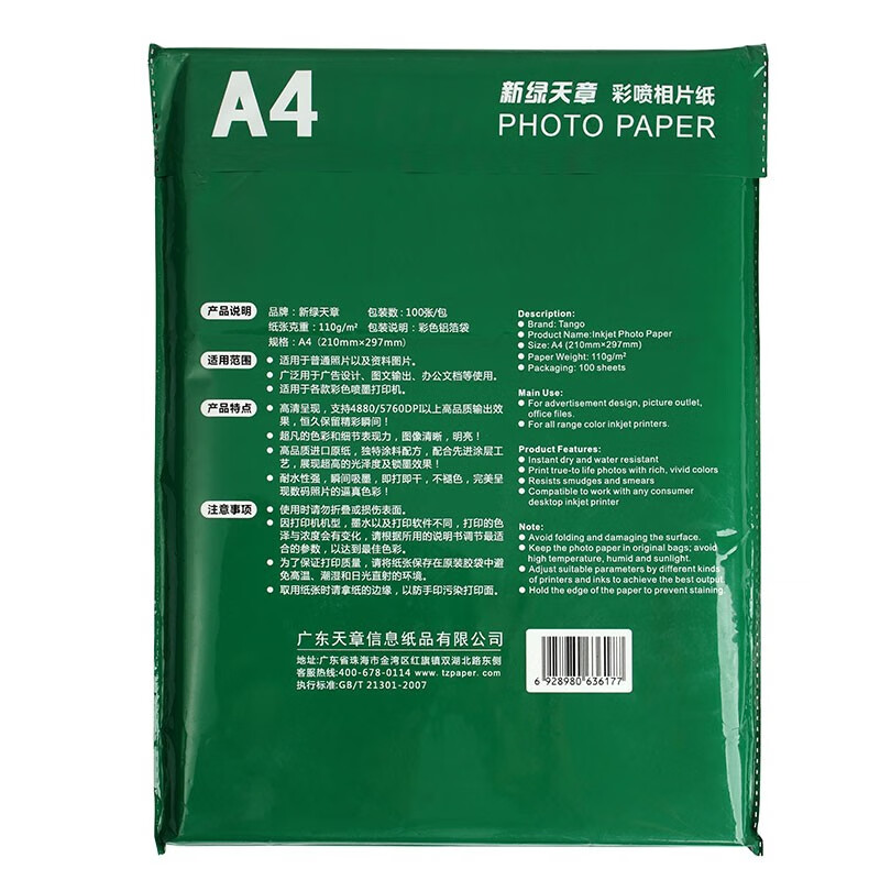 天章(TANGO)新绿天章A4彩喷纸(110克 100张/包) 自营