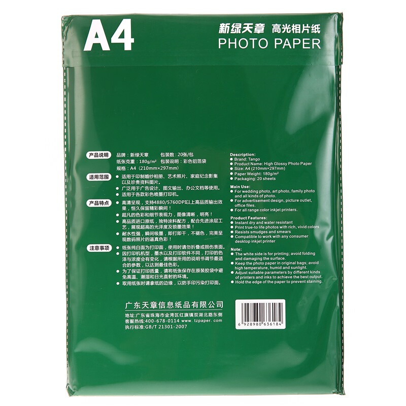 天章(TANGO)新绿天章A4高光相片纸(180克 20张/包) 自营