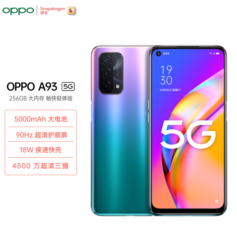 OPPO A93 8+128GB 极光 骁龙双模5G 超大存储 5000mAh大电池 18W疾速快充 90Hz高刷屏 4800万三摄 全面屏手机 自营