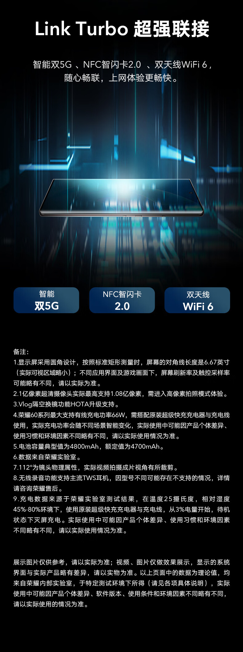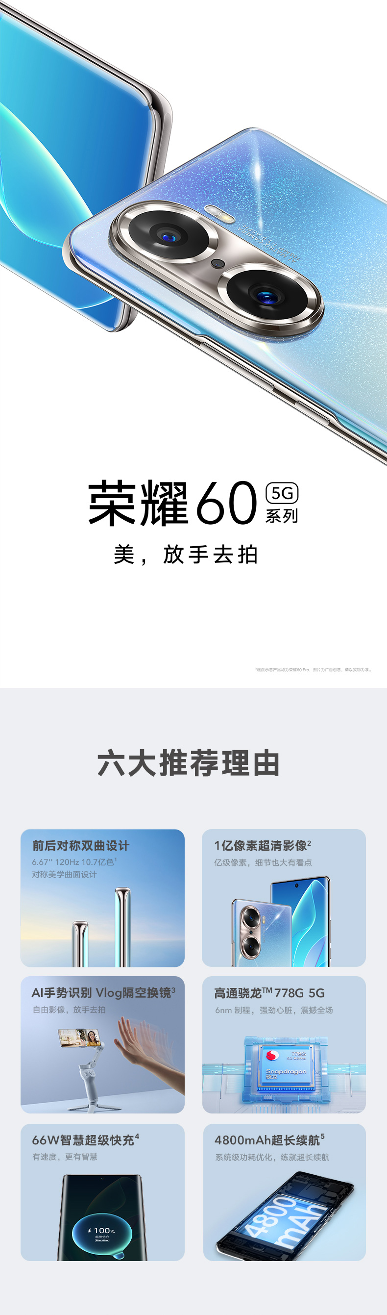 荣耀60 前后双曲设计 1亿像素超清摄影 高通骁龙778G 5G 66W智慧超级快充 全网通版 8GB+128GB 幻境星空 自营